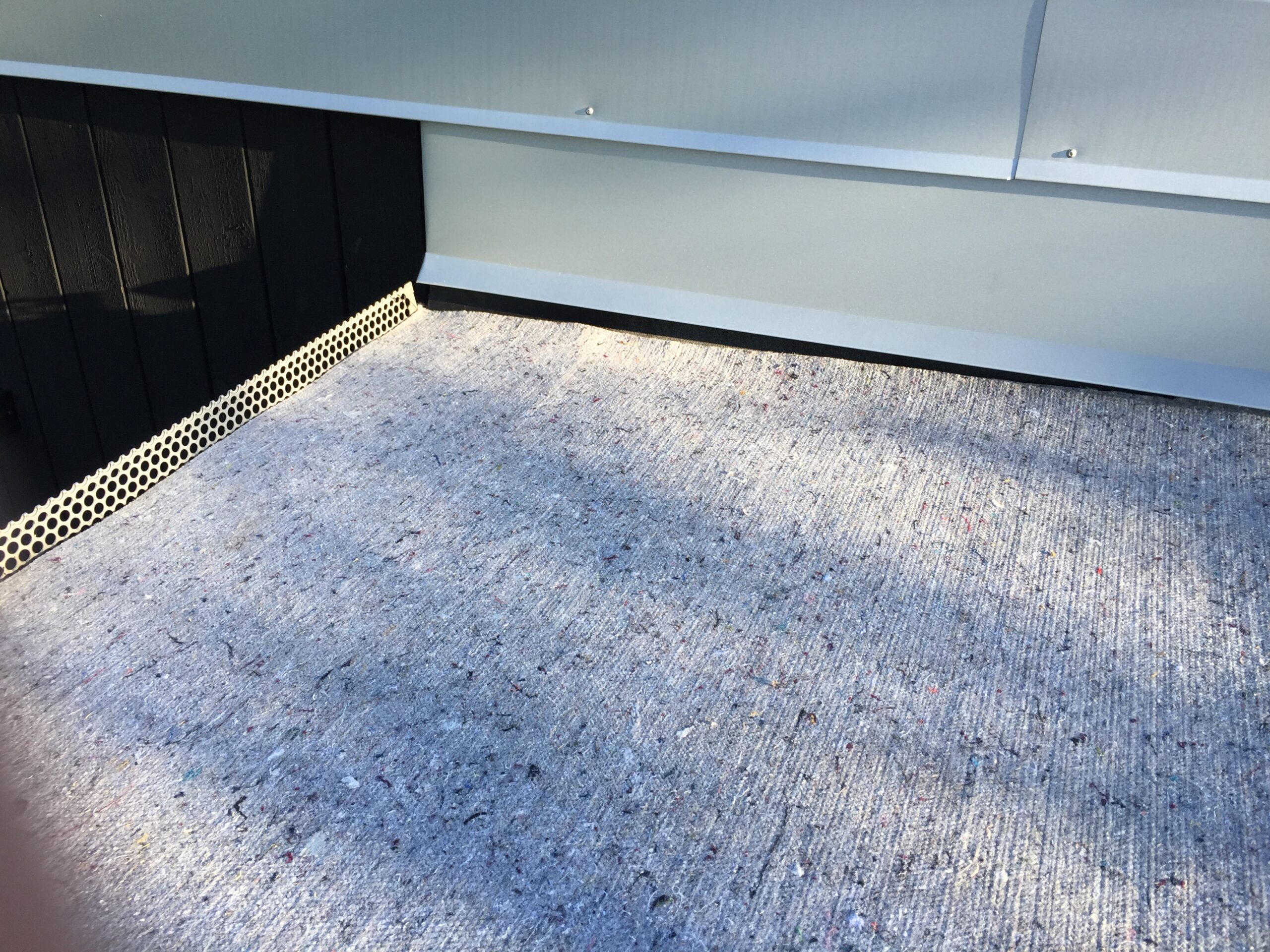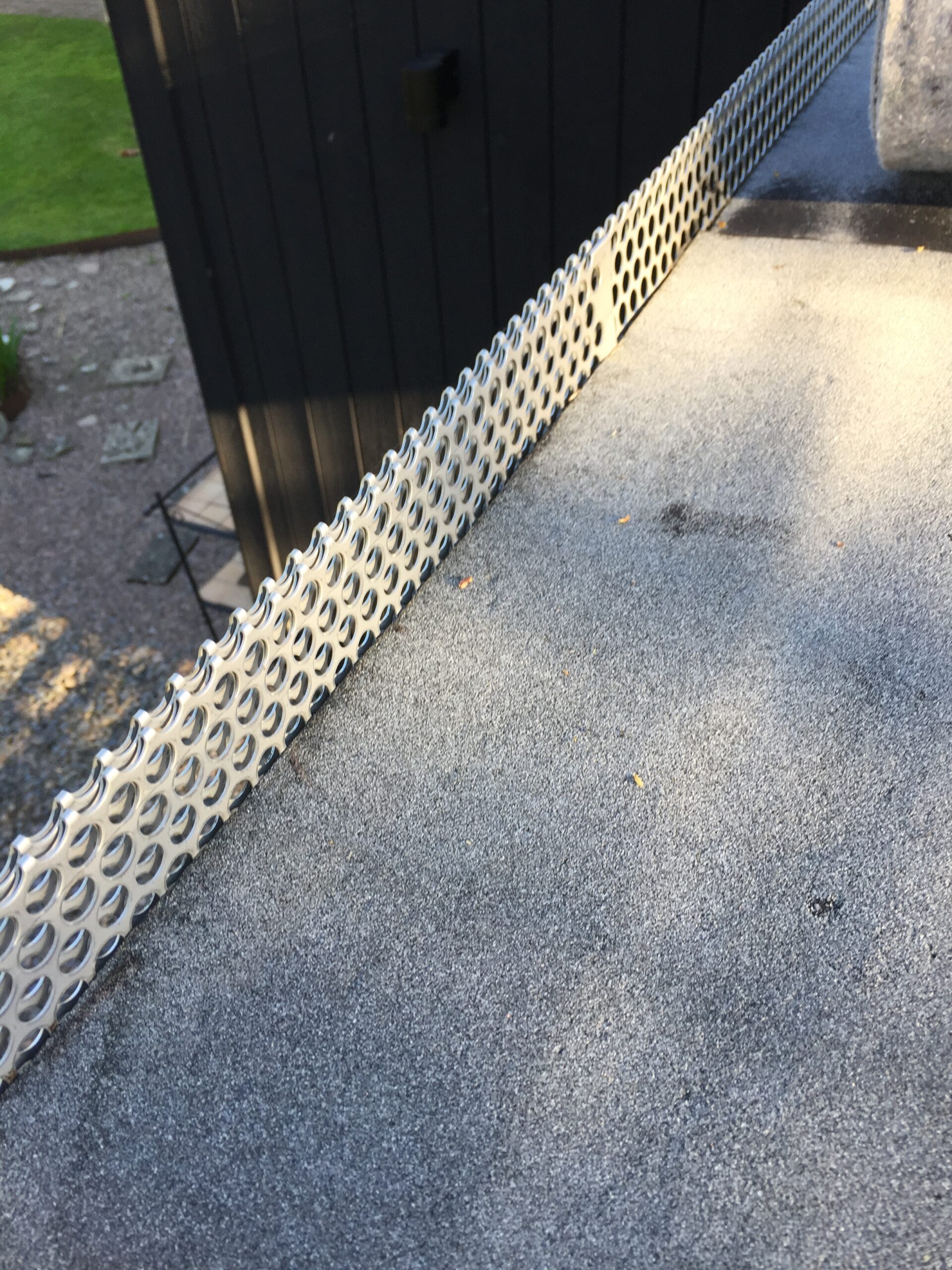 För att bli av med överflödigt regnvatten sätts ett kantavslut i nederkant. Denna håller även sedumtaket på plats så det inte kasar av. Kantavslutet är en rostfri, perforerad vinkellist.