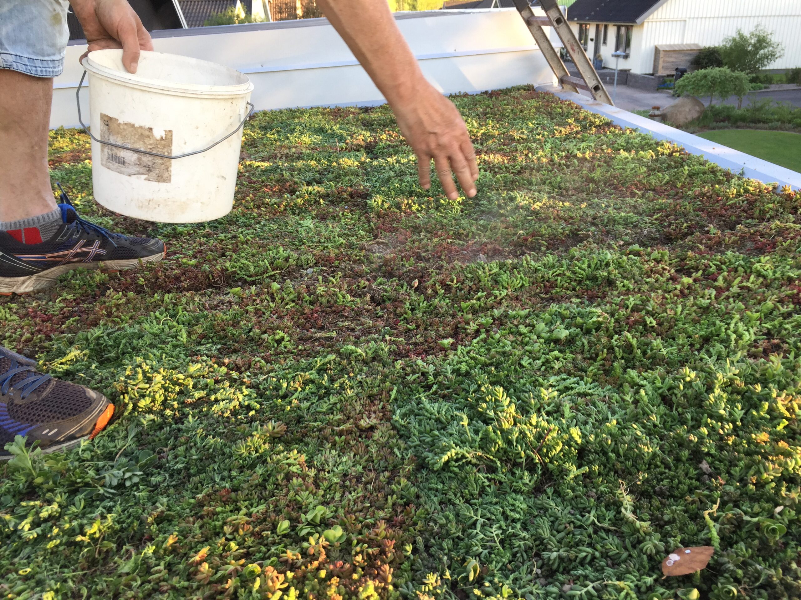 Tänk på att inte övervattna eftersom meningen är; miljön på taket skall vara så torr så att det bara är sedumen som trivs. Ev ogräs skall helst torka bort (annars måste det rensas bort).